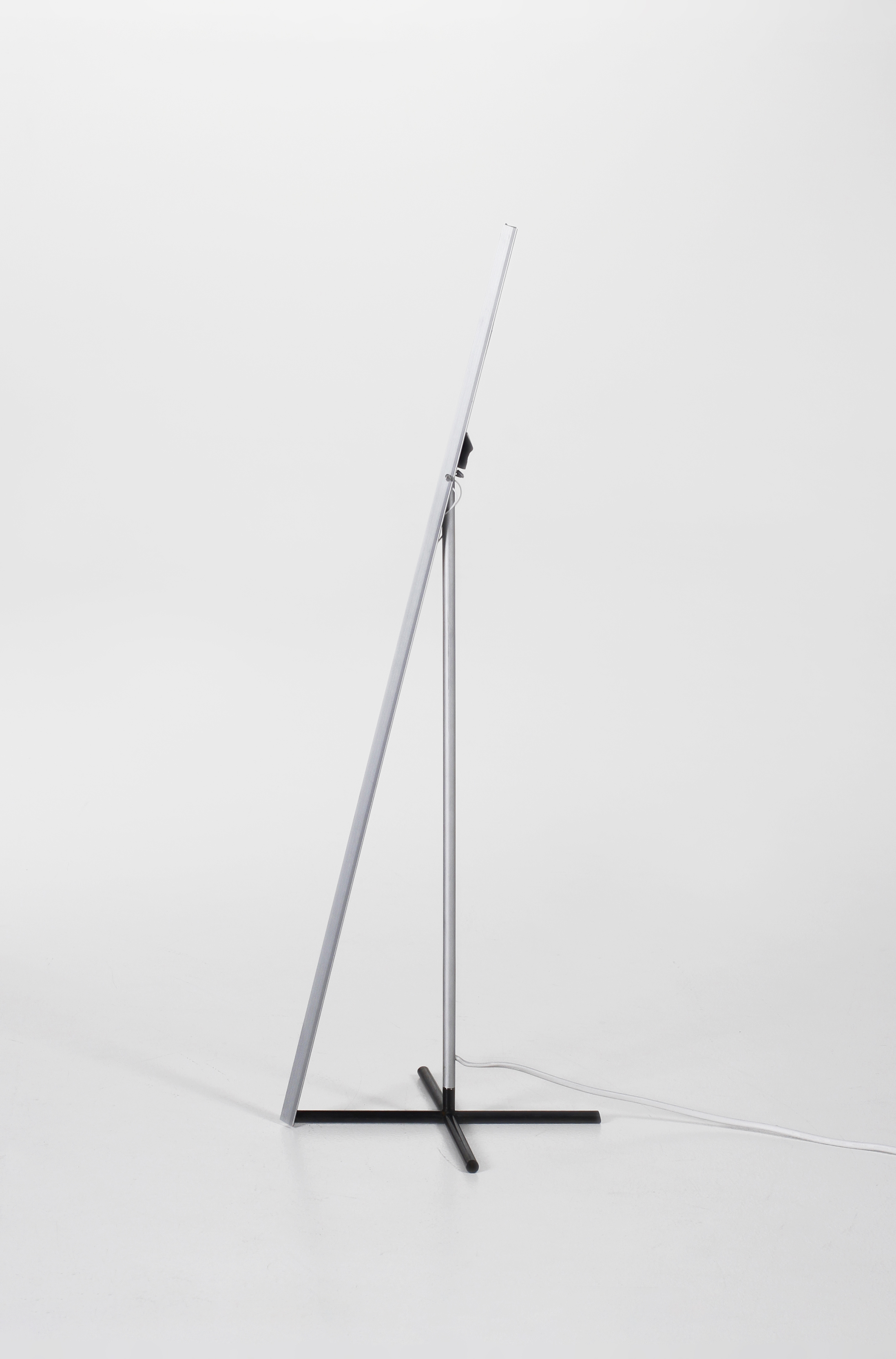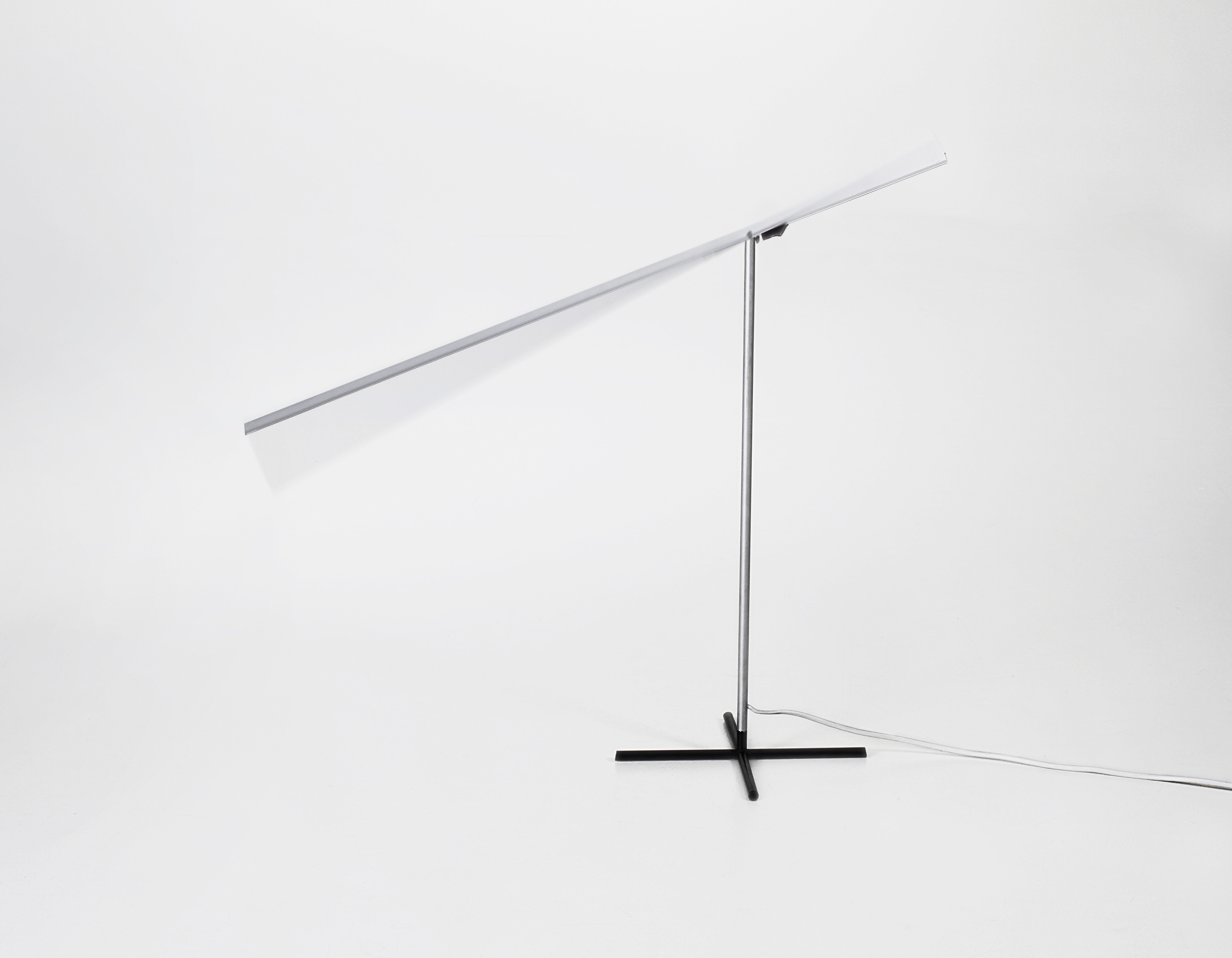 The light is off when Crane’s head is bent down. To awaken it, one gently pulls the head to detach the magnet inside from the steel foot. Then a counterweight in the short part of the head pulls the head up. Once the head is horizontal a micro switch turns the light on.