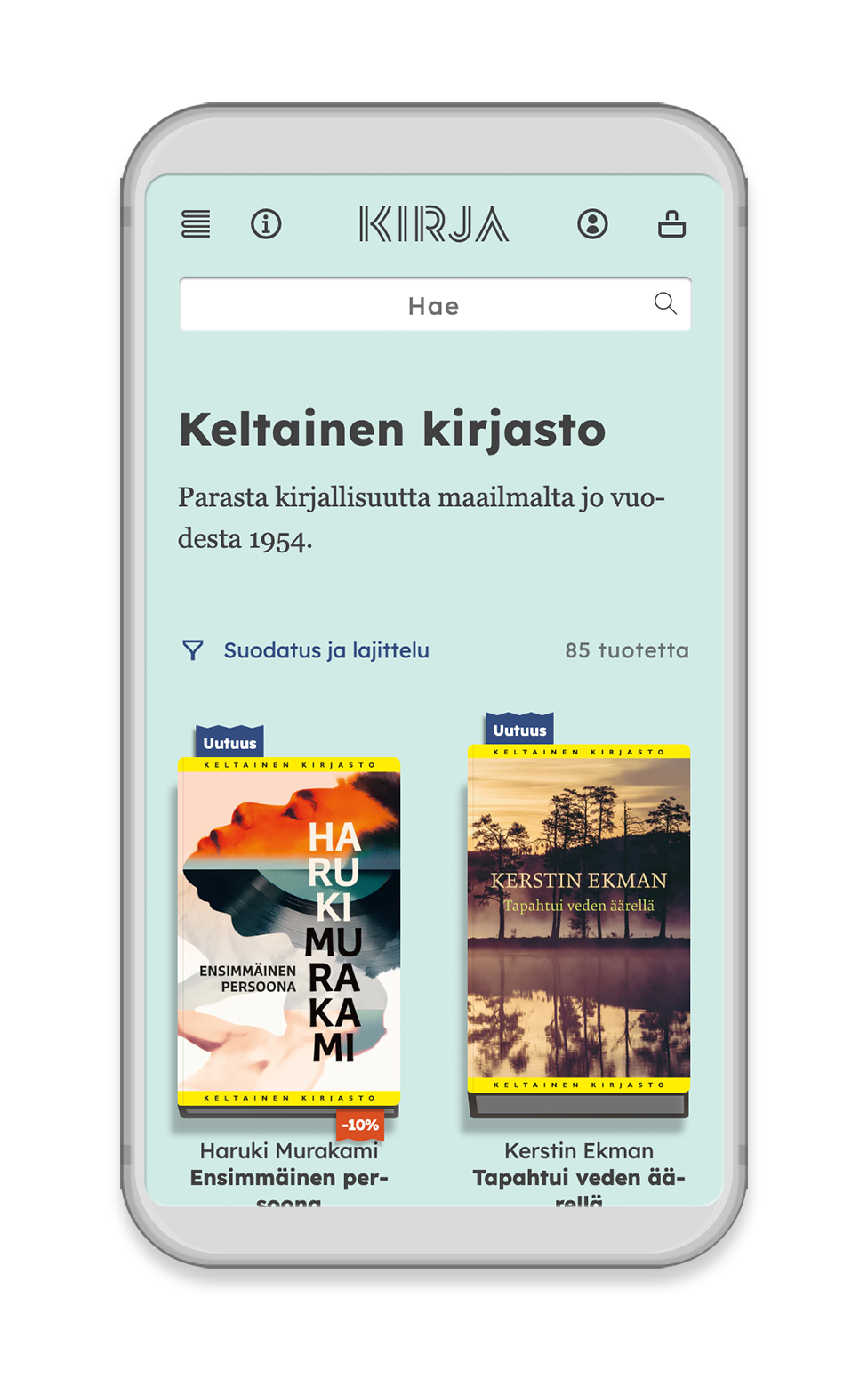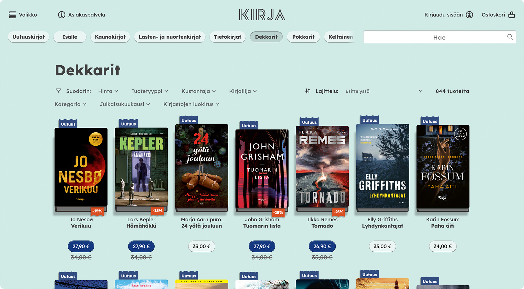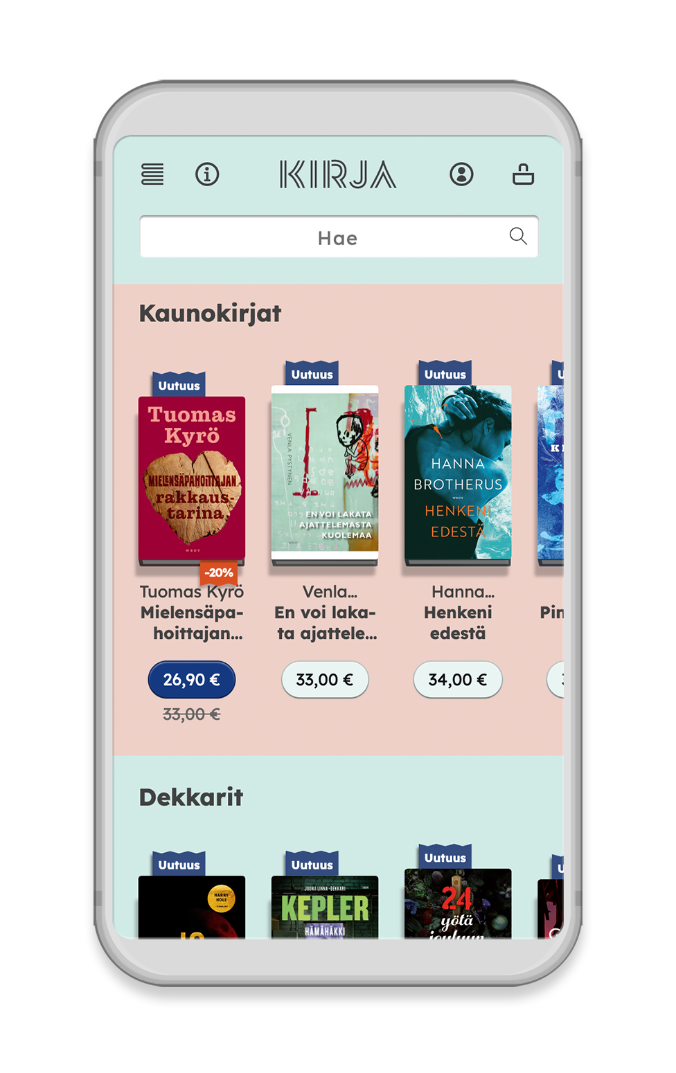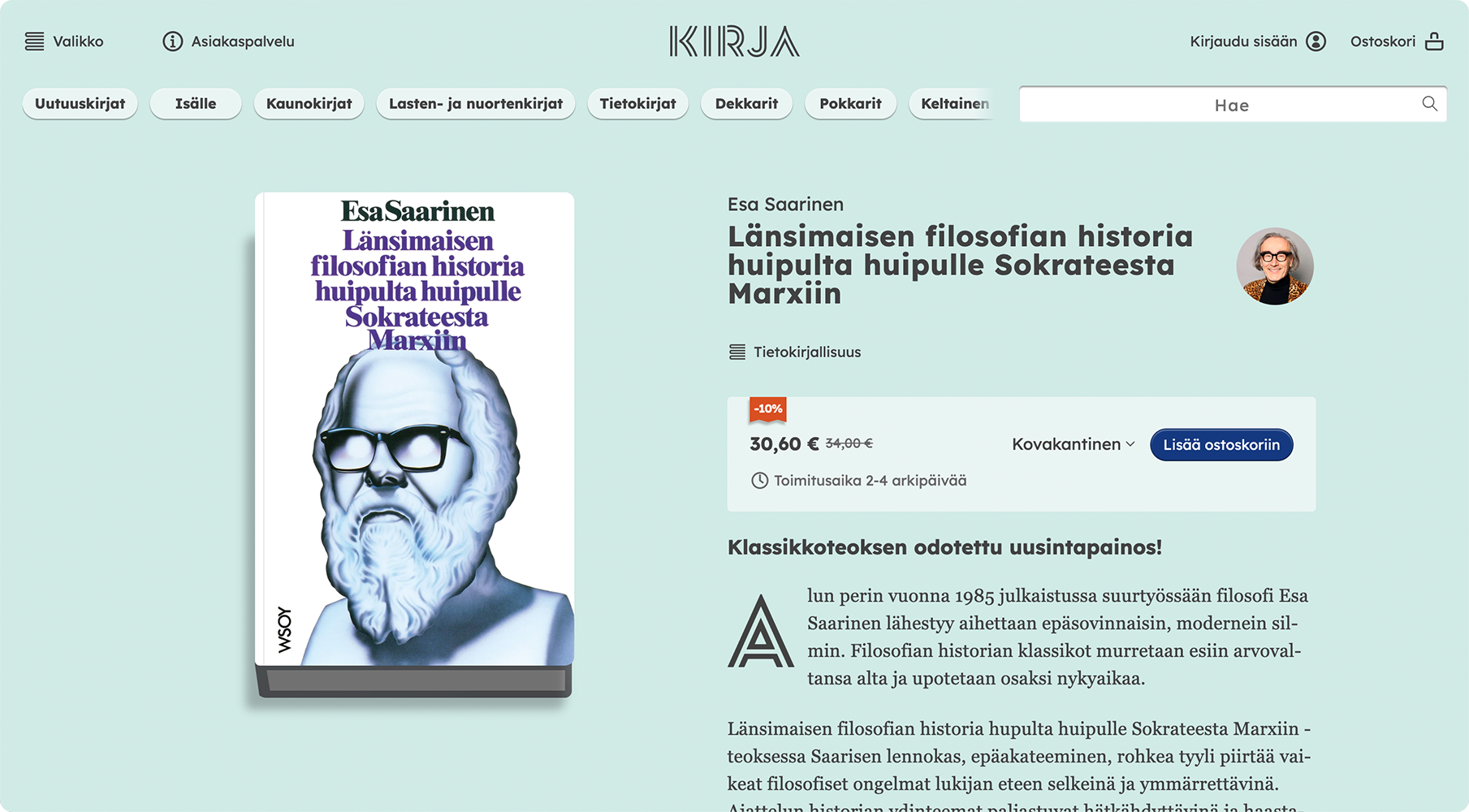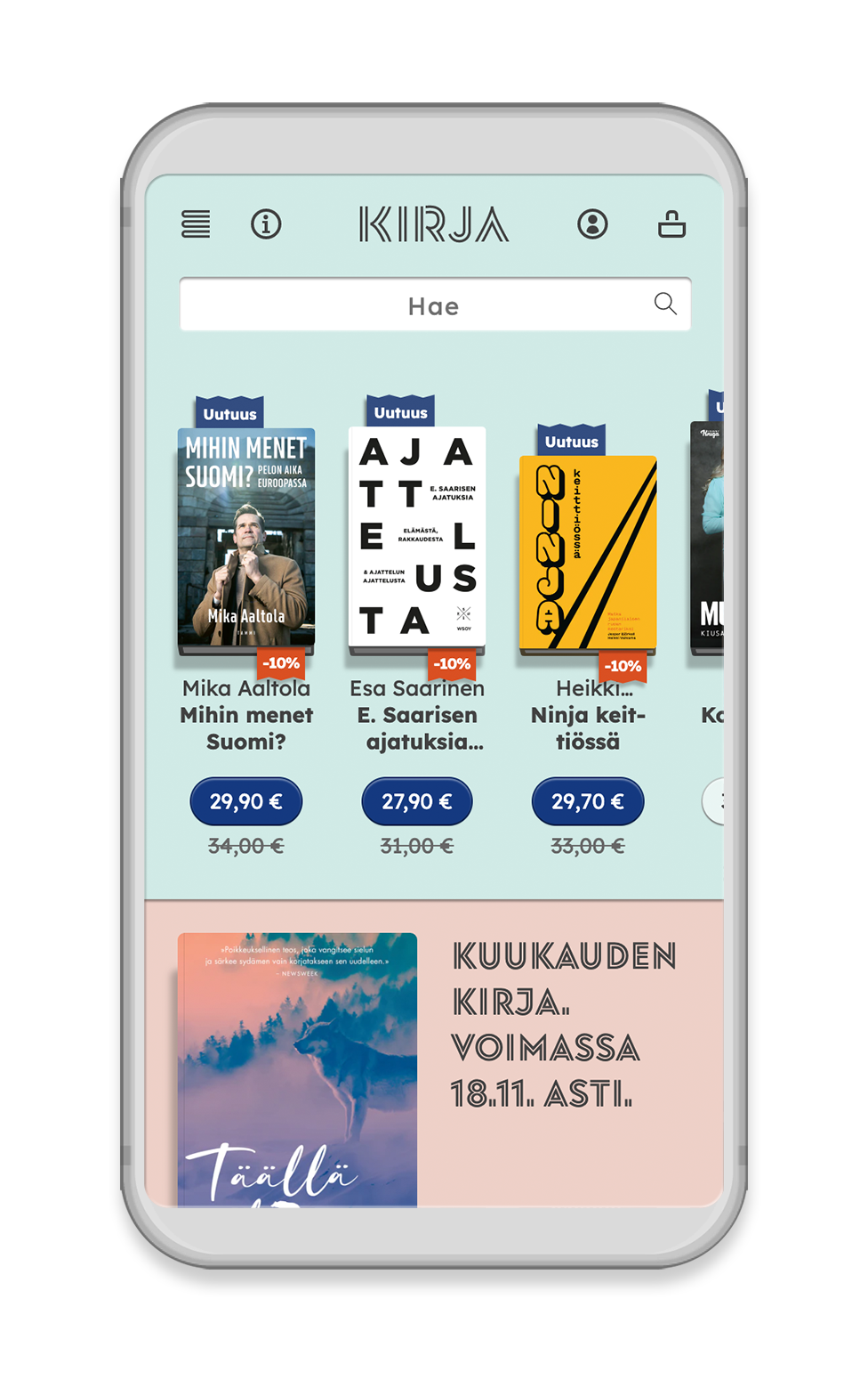Kirja.fi ('Book') is a webstore for the largest publisher of books in Finland, Werner Söderström Oy. Even with audiobooks gaining in popularity, the physical book can still more than hold its own. The design accordingly highlights the physical nature of books.